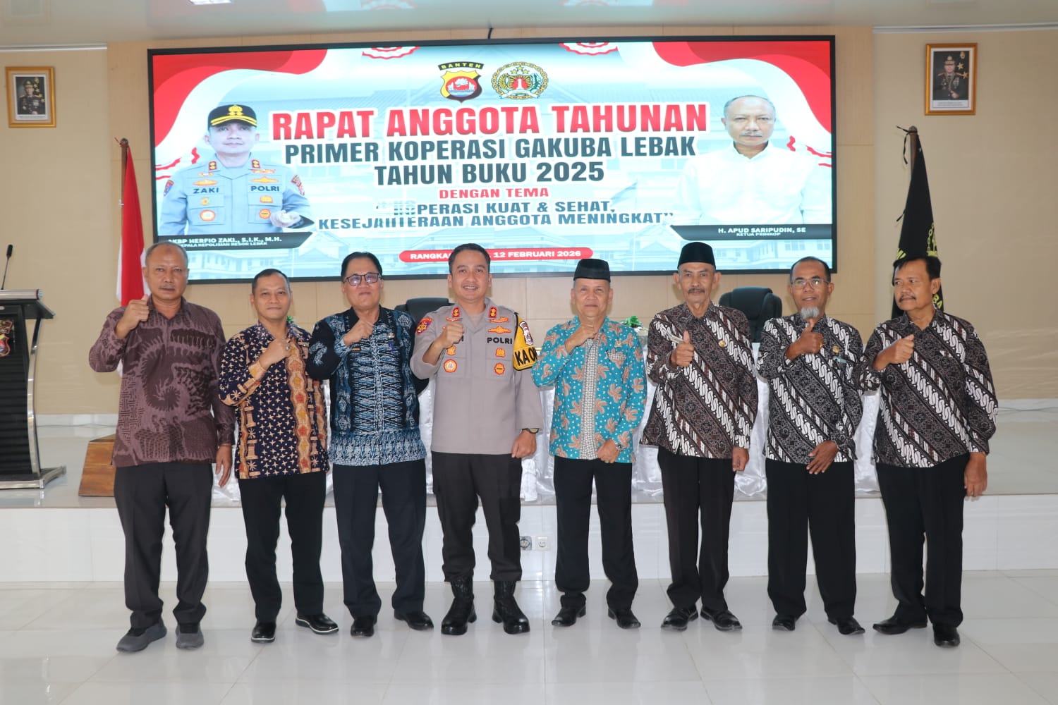 Lebak – Kapolres Lebak AKBP Herfio Zaki, S.I.K., M.H membuka secara resmi Rapat Akhir Tahunan (RAT) Primer Koperasi Gakuba Lebak Tahun Buku 2025 dengan tema “Koperasi Kuat dan Sehat, Kesejahteraan Anggota Meningkat”. Kegiatan tersebut dilaksanakan di Aula Sanika Satyawada Polres Lebak pada Kamis (12/2/2026).